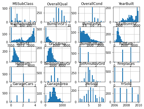toy dataset치고는 칼럼이 많네요 drop_col = ['LotArea','BsmtFinSF2','LowQualFinSF','2ndFlrSF','BsmtHalfBath','KitchenAbvGr','WoodDeckSF','OpenPorchSF','EnclosedPorch','3SsnPorch','ScreenPorch','PoolArea','MiscVal'] df3 = df2.drop(drop_col, axis=1) df3.hist(bins=30, figsize=(8,6))