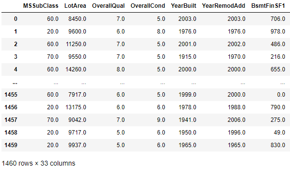 MSSubClass 56.897260 OverallQual 6.099315 OverallCond 5.575342 YearBuilt 1971.267808 YearRemodAdd 1984.865753 BsmtFinSF1 443.639726 BsmtUnfSF 567.240411 TotalBsmtSF 1057.429452 1stFlrSF 1162.626712 GrLivArea 1515.463699 BsmtFullBath 0.425342 FullBath 1.565068 HalfBath 0.382877 BedroomAbvGr 2.866438 TotRmsAbvGrd 6.517808 Fireplaces 0.613014 GarageCars 1.767123 GarageArea 472.980137 MoSold 6.321918 YrSold 2007.815753 dtype: float64