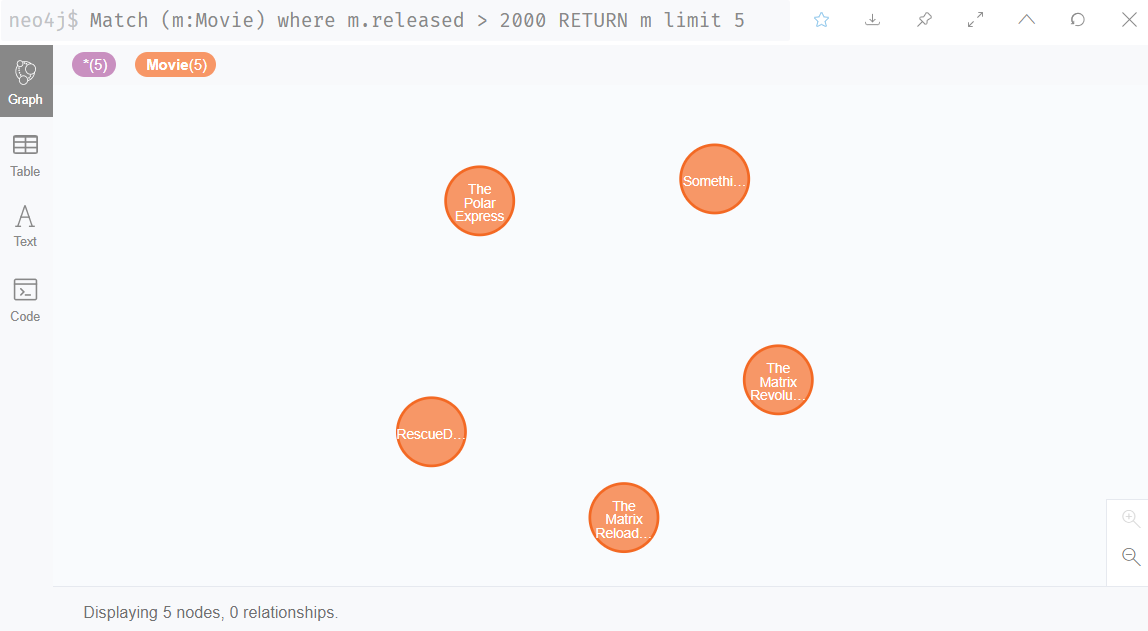 Match (m:Movie) where m.released > 2000 RETURN m limit 5 Match (m:Movie) RETURN M이런 방식으로 말이죠.