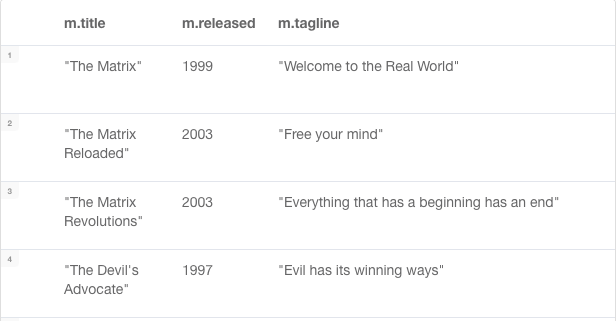 Cypher쿼리로는 {name: 'John Doe'}와 같이 표현합니다.MATCH (m:Movie) return m.title, m.released