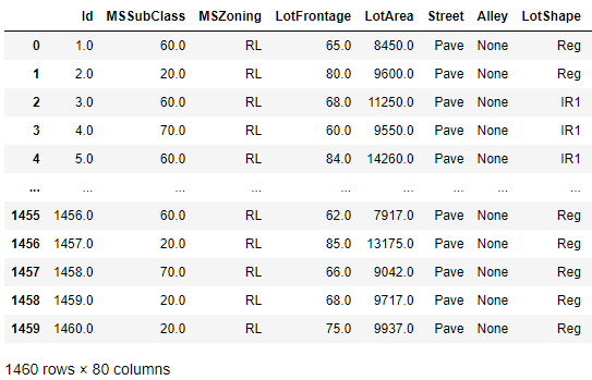 import pandas as pd from sklearn.datasets import fetch_openml housing = fetch_openml(name="house_prices", as_frame=True) X = housing['data'] feature_names = housing['feature_names'] df = pd.DataFrame(X, columns = feature_names) df