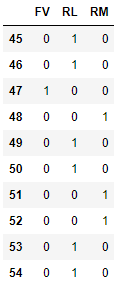 data = df['MSZoning'].iloc[45:55] print(data) # 45 RL # 46 RL # 47 FV # 48 RM # 49 RL # 50 RL # 51 RM # 52 RM # 53 RL # 54 RL # Name: MSZoning, dtype: object # pd.get_dummies(X) one_hot_df = pd.get_dummies(data) one_hot_df