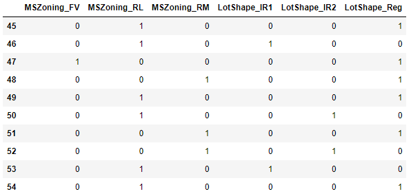 data = df[['MSZoning','LotShape']].iloc[45:55] one_hot_df = pd.get_dummies(data) one_hot_df
