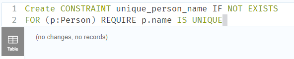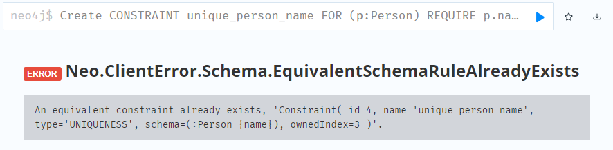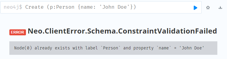 Create CONSTRAINT unique_person_name FOR (p:Person) REQUIRE p.name IS UNIQUE이렇게 제약조건을 걸어놓으면 이미 있는 데이터인 'John Doe'라는 사람의 데이터가 중복으로 들어가는 것을 막을 수 있습니다.
