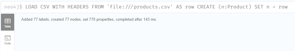 LOAD CSV WITH HEADERS FROM 'file:///products.csv' AS row CREATE (n:Product) SET n = row