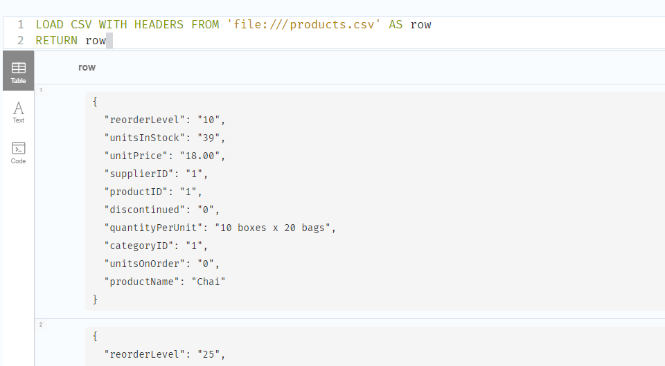 LOAD CSV WITH HEADERS FROM 'file:///products.csv' AS row RETURN row;