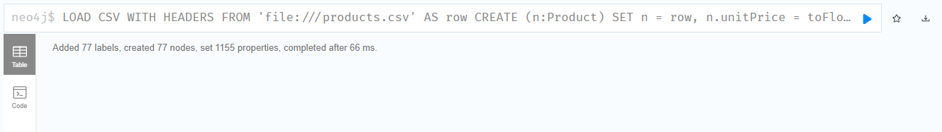 LOAD CSV WITH HEADERS FROM 'file:///products.csv' AS row CREATE (n:Product) SET n = row