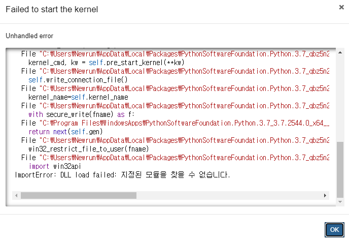ImportError: DLL load failed: 지정된 모듈을 찾을 수 없습니다. [W 12:42:47.961 NotebookApp] Unhandled error [E 12:42:47.965 NotebookApp] { "Host": "localhost:8888", "Connection": "keep-alive", "Content-Length": "99", "Sec-Ch-Ua": "\".Not/A)Brand\";v=\"99\", \"Google Chrome\";v=\"103\", \"Chromium\";v=\"103\"", "Sec-Ch-Ua-Mobile": "?0", "User-Agent": "Mozilla/5.0 (Windows NT 10.0; Win64; x64) AppleWebKit/537.36 (KHTML, like Gecko) Chrome/103.0.0.0 Safari/537.36", "Content-Type": "application/json", "Accept": "application/json, text/javascript, */*; q=0.01", "X-Requested-With": "XMLHttpRequest", "X-Xsrftoken": "블라블라블라", "Sec-Ch-Ua-Platform": "\"Windows\"", "Origin": "http://localhost:8888", "Sec-Fetch-Site": "same-origin", "Sec-Fetch-Mode": "cors", "Sec-Fetch-Dest": "empty", "Referer": "http://localhost:8888/notebooks/harv_experiment1.ipynb", "Accept-Encoding": "gzip, deflate, br", "Accept-Language": "ko-KR,ko;q=0.9,en-US;q=0.8,en;q=0.7", "Cookie": "블라블라블라"" } [E 12:42:47.967 NotebookApp] 500 POST /api/sessions (::1) 22.00ms referer=http://localhost:8888/notebooks/harv_experiment1.ipynb500 POST가 뜨는거 보면 확실히 문제가 있네요