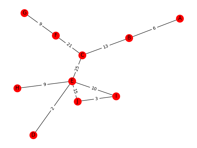 import networkx as nx %matplotlib notebook G = nx.Graph() G.add_edge('B','A',weight=6) G.add_weighted_edges_from([('B','C',13),('C','F',21),('C','E',25), ('E','D',2),('G','F',9),('H','E',9), ('E','I',10),('E','J',15),('I','J',3)])비가중그래프(이전 포스트에서 다루었던 단순 무방향/방향 그래프)와 마찬가지로,