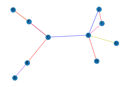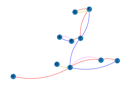 import networkx as nx # %matplotlib notebook G = nx.DiGraph() family = [('G','F'),('D','E')] friend = [('A','B'),('C','F'),('C','E'),('E','J')] coworker = [('B','C'),('C','F'),('I','J'),('E','H'),('G','F'),('E','I')] neighbor = [('E','I'),('A','B')] G.add_edges_from(family,relation='family') G.add_edges_from(friend,relation='friend') G.add_edges_from(coworker,relation='coworker') G.add_edges_from(neighbor,relation='neighbor') pos=nx.spring_layout(G) # 각 노드, 엣지를 draw하기 위한 position 정보 relation = nx.get_edge_attributes(G, 'relation') nx.draw(G,pos, with_labels=True, edge_color='white') nx.draw_networkx_edges(G,pos, edgelist=family, edge_color='Y', connectionstyle='arc3, rad = 0.2', arrowstyle='-') nx.draw_networkx_edges(G,pos, edgelist=friend, edge_color='B', connectionstyle='arc3, rad = 0.2', arrowstyle='-') nx.draw_networkx_edges(G,pos, edgelist=coworker, edge_color='R', connectionstyle='arc3, rad = -0.2', arrowstyle='-') nx.draw_networkx_edges(G,pos, edgelist=neighbor, edge_color='violet', connectionstyle='arc3, rad = -0.4', arrowstyle='-')