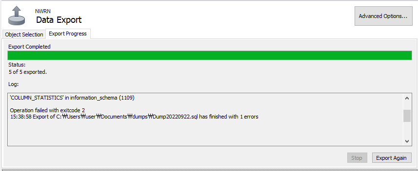 15:38:58 Dumping ProjectDB (all tables) Running: "C:\Program Files\MySQL\MySQL Server 8.0\bin\mysqldump.exe" --defaults-file="C:\Users\user\AppData\Local\Temp\tmpfiautq59.cnf" --host=아마존 --port=3306 --default-character-set=utf8 --user=유저 --protocol=tcp --skip-triggers "ProjectDB" mysqldump: Couldn't execute 'SELECT COLUMN_NAME, JSON_EXTRACT(HISTOGRAM, '$."number-of-buckets-specified"') FROM information_schema.COLUMN_STATISTICS WHERE SCHEMA_NAME = 'ProjectDB' AND TABLE_NAME = 'category';': Unknown table 'COLUMN_STATISTICS' in information_schema (1109) Operation failed with exitcode 2 15:38:58 Export of C:\Users\user\Documents\dumps\Dump20220922.sql has finished with 1 errors검색해보니 예전에는 Workbench의 [Advanced Options]에서 설정할 수 있었지만, 현 버전에서는 해당 기능을 지원하지 않는다고 합니다.