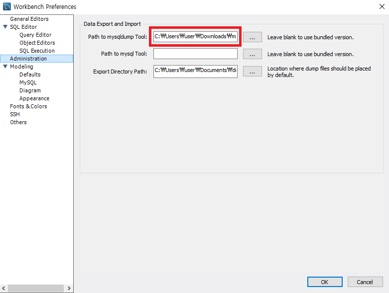 Path to mysqldump Tool에 위에서 복사한 위치를 붙여넣어줍니다.