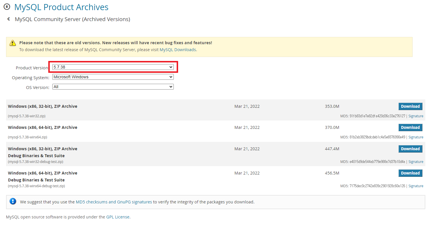 Please note that these are old versions. New releases will have recent bug fixes and features! To download the latest release of MySQL Community Server, please visit MySQL Downloads. MySQL open source software is provided under the GPL License.