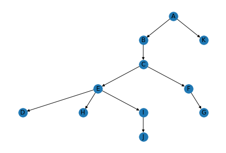 # BFS T = nx.bfs_tree(G,'A') # 결과 확인하기 T.edges() # OutEdgeView([('A', 'B'), ('A', 'K'), ('B', 'C'), ('C', 'E'), ('C', 'F'), # ('E', 'D'), ('E', 'H'), ('E', 'I'), ('F', 'G'), ('I', 'J')])BFS 트리구조 plot 그리기