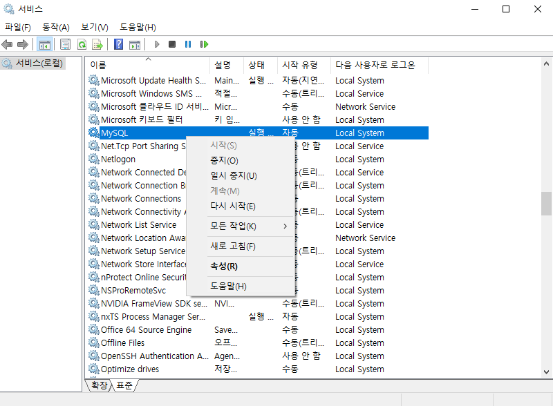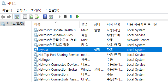관리도구-서비스에 들어가서 MySQL을 실행시켜준다.