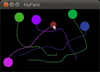 from random import random from kivy.app import App from kivy.uix.widget import Widget from kivy.graphics import Color, Ellipse, Line class MyPaintWidget(Widget): def on_touch_down(self, touch): color = (random(), random(), random()) #1 with self.canvas: Color(*color) #2 d = 30. Ellipse(pos=(touch.x - d / 2, touch.y - d / 2), size=(d, d)) touch.ud['line'] = Line(points=(touch.x, touch.y)) def on_touch_move(self, touch): touch.ud['line'].points += [touch.x, touch.y] class MyPaintApp(App): def build(self): return MyPaintWidget() if __name__ == '__main__': MyPaintApp().run()이번에는 더욱 간단합니다.