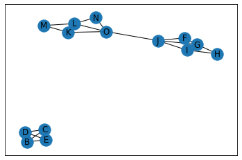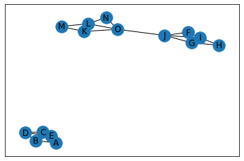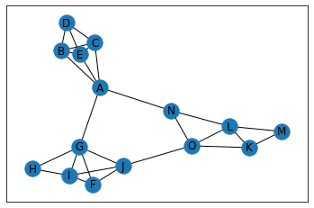import networkx as nx edges = [('A','E'),('A','B'),('A','N'),('A','G'),('A','C'), ('B','C'),('B','D'),('B','E'),('C','D'),('C','E'), ('D','E'),('G','F'),('G','H'),('G','I'),('G','J'), ('F','I'),('F','J'),('H','I'),('I','J'),('J','O'), ('O','N'),('O','K'),('O','L'),('N','L'),('K','L'), ('K','M'),('L','M')] G = nx.Graph() G.add_edges_from(edges)