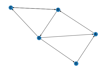 import networkx as nx edges = [('A','B'),('B','C'),('B','D'),('C','B'),('D','A'),('D','C'),('D','E'),('E','A')] G = nx.DiGraph() G.add_edges_from(edges) # 네트워크 그리기 pos = nx.kamada_kawai_layout(G) nx.draw(G, pos, with_labels=True)