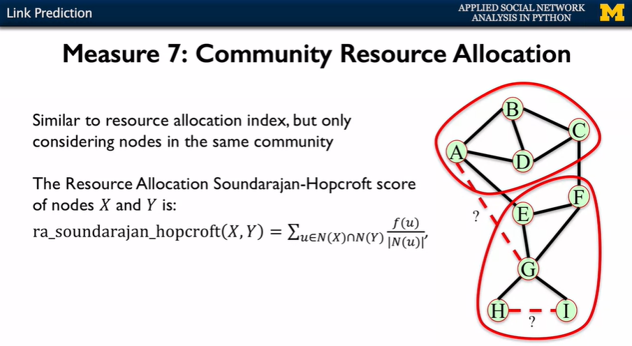 cn_s_h = list(nx.cn_soundarajan_hopcroft(G)) cn_s_h.sort(key=lambda x: x[2], reverse=True) # 정렬 cn_s_h # 출력 [('A', 'C', 4), # 2+2 ('F', 'I', 2), # 1+1 ('F', 'H', 2), # 1+1방법7. 자원할당 X 커뮤니티 (R.A. Soundarajan-Hopcroft score)