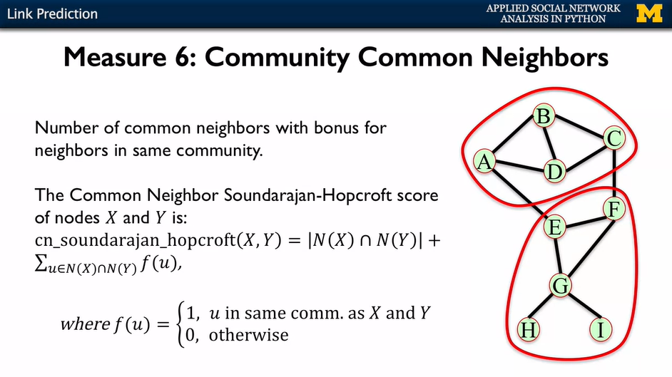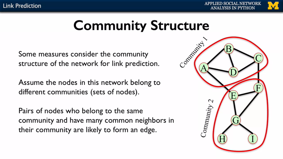 [A,B,C,D] VS [E,F,G,H,I] 두개의 커뮤니티가 있다고 가정하겠습니다. import networkx as nx edges = [('A','B'),('A','D'),('A','E'),('B','D'),('B','C'),('C','D'),('C','F'), ('E','F'),('E','G'),('F','G'),('G','H'),('G','I')] community0 = ['A','B','C','D'] community1 = ['E','F','G','H','I'] G = nx.Graph() G.add_edges_from(edges) G.add_nodes_from(community0, community=0) G.add_nodes_from(community1, community=1) G.nodes(data=True) # 출력 NodeDataView({'A': {'community': 0}, 'B': {'community': 0}, 'D': {'community': 0}, 'E': {'community': 1}, 'C': {'community': 0}, 'F': {'community': 1}, 'G': {'community': 1}, 'H': {'community': 1}, 'I': {'community': 1}})방법6. 공통이웃 + 커뮤니티 (C.N. Soundarajan-Hopcroft score)