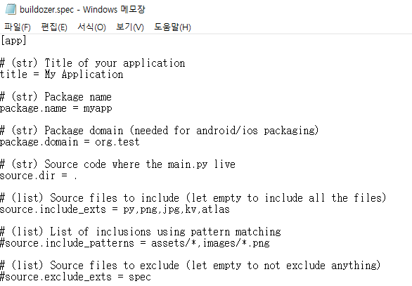 buildozer.spec 파일이 새로 생성되었습니다. 그리고 이 파일을 열어보면 어플의 이름 등, 세부 속성을 변경할 수 있습니다.