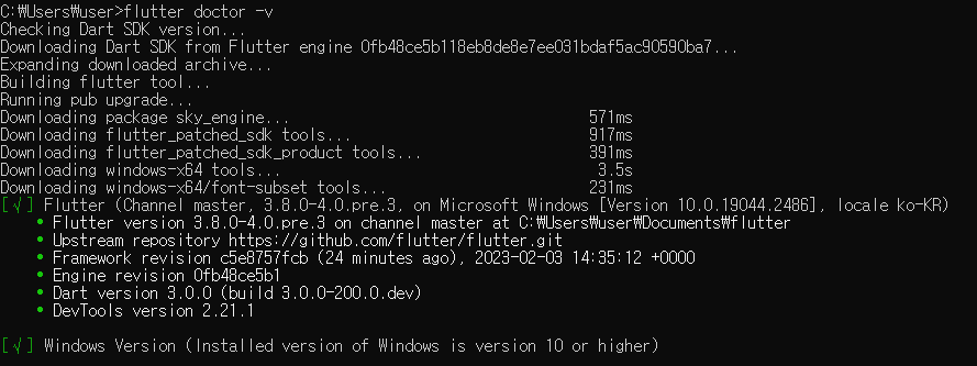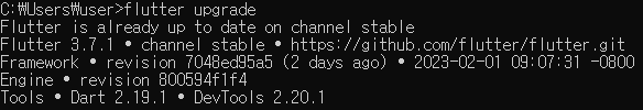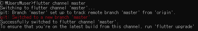 C:\>flutter upgrade C:\>flutter channel master C:\>flutter doctor -v1. 먼저 업그레이드를 해줍니다.