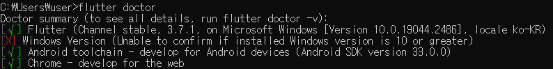 잘 설치가 되었는지 flutter doctor를 입력해봤는데