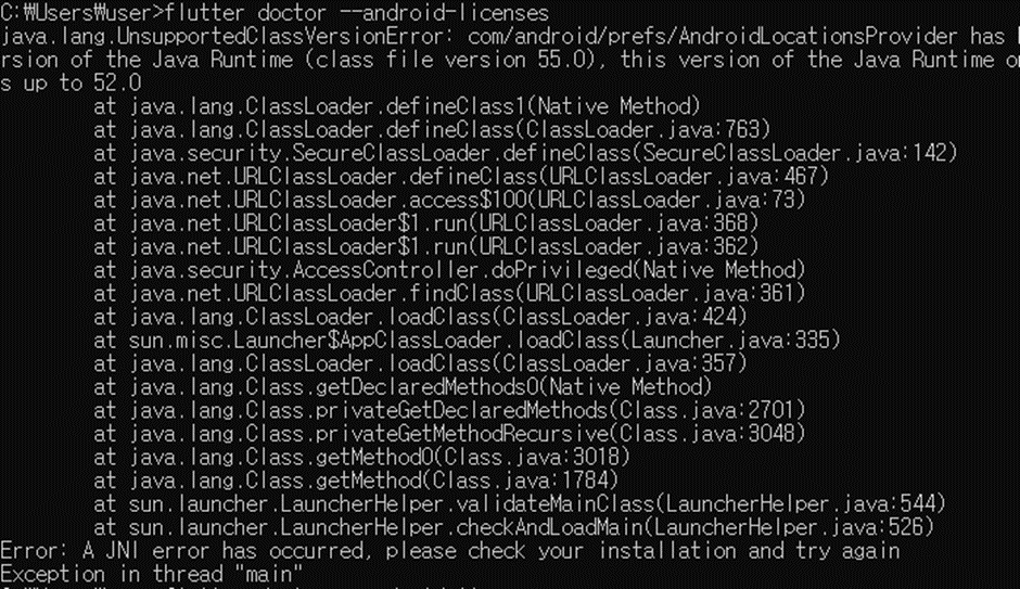 이럴줄 알았으면 용량 부족하다고 안드로이드 스튜디오 지우지 말고 다른거 지울걸 >flutter doctor --android-licenses java.lang.UnsupportedClassVersionError: com/android/prefs/AndroidLocationsProvider has been compiled by a more recent version of the Java Runtime (class file version 55.0), this version of the Java Runtime only recognizes class file versions up to 52.0 at java.lang.ClassLoader.defineClass1(Native Method) at java.lang.ClassLoader.defineClass(ClassLoader.java:763) at java.security.SecureClassLoader.defineClass(SecureClassLoader.java:142) at java.net.URLClassLoader.defineClass(URLClassLoader.java:467) at java.net.URLClassLoader.access$100(URLClassLoader.java:73) at java.net.URLClassLoader$1.run(URLClassLoader.java:368) at java.net.URLClassLoader$1.run(URLClassLoader.java:362) at java.security.AccessController.doPrivileged(Native Method) at java.net.URLClassLoader.findClass(URLClassLoader.java:361) at java.lang.ClassLoader.loadClass(ClassLoader.java:424) at sun.misc.Launcher$AppClassLoader.loadClass(Launcher.java:335) at java.lang.ClassLoader.loadClass(ClassLoader.java:357) at java.lang.Class.getDeclaredMethods0(Native Method) at java.lang.Class.privateGetDeclaredMethods(Class.java:2701) at java.lang.Class.privateGetMethodRecursive(Class.java:3048) at java.lang.Class.getMethod0(Class.java:3018) at java.lang.Class.getMethod(Class.java:1784) at sun.launcher.LauncherHelper.validateMainClass(LauncherHelper.java:544) at sun.launcher.LauncherHelper.checkAndLoadMain(LauncherHelper.java:526) Error: A JNI error has occurred, please check your installation and try again Exception in thread "main"원인?