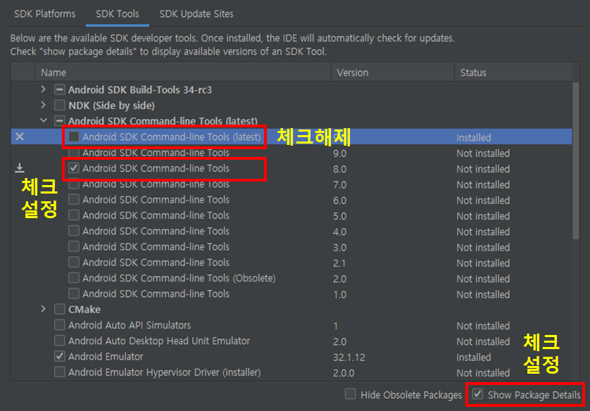 SDK Tools 탭을 누릅니다. 2. Androiod SDK Command-line Tools 을 8.0으로 변경