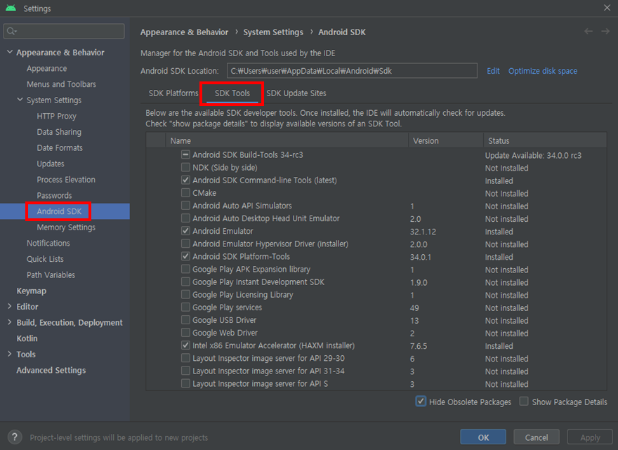 1. Android Studio - SDK Manager - System Settings