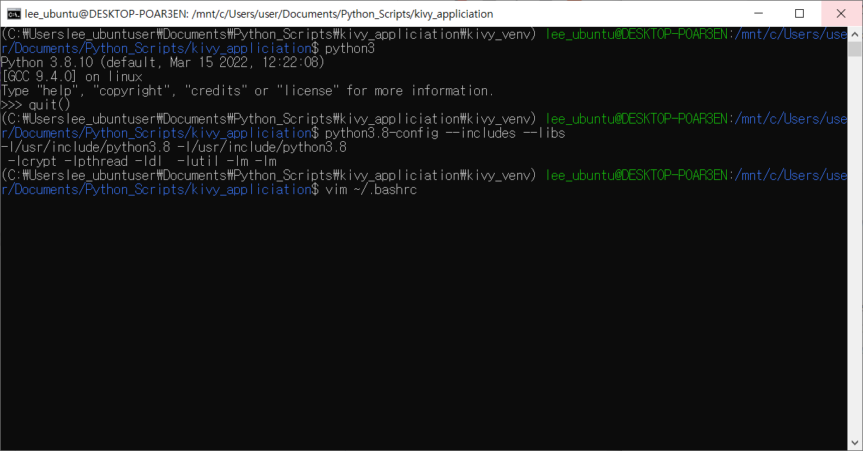 $ python3 # Python 3.8.10 (default, Mar 15 2022, 12:22:08) >>> quit() $ python3.8-config --includes --libs # -I/usr/include/python3.8 -I/usr/include/python3.8 # -lcrypt -lpthread -ldl -lutil -lm -lm $ vim ~/.bashrc