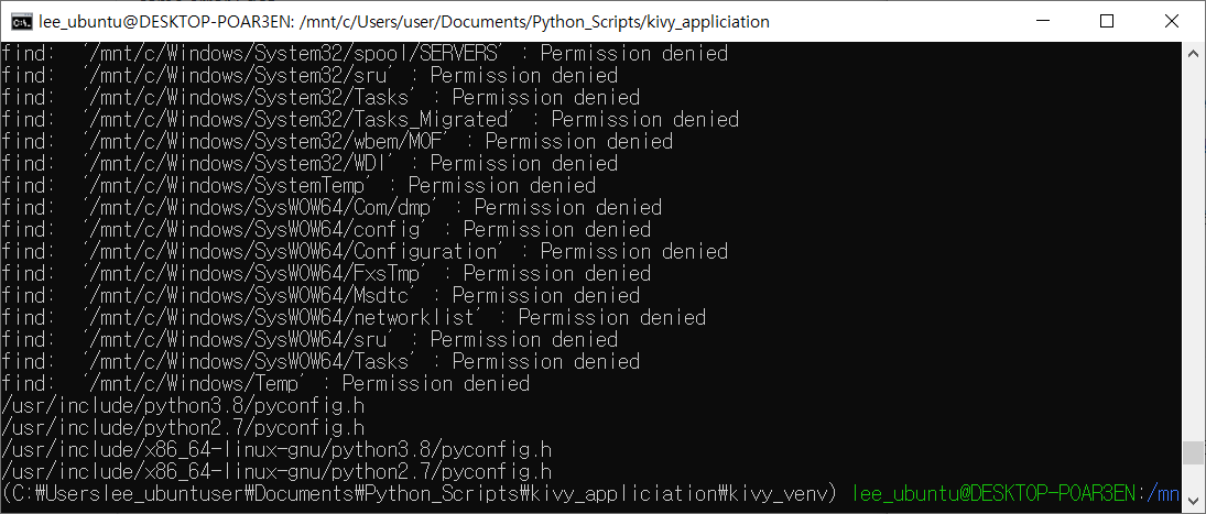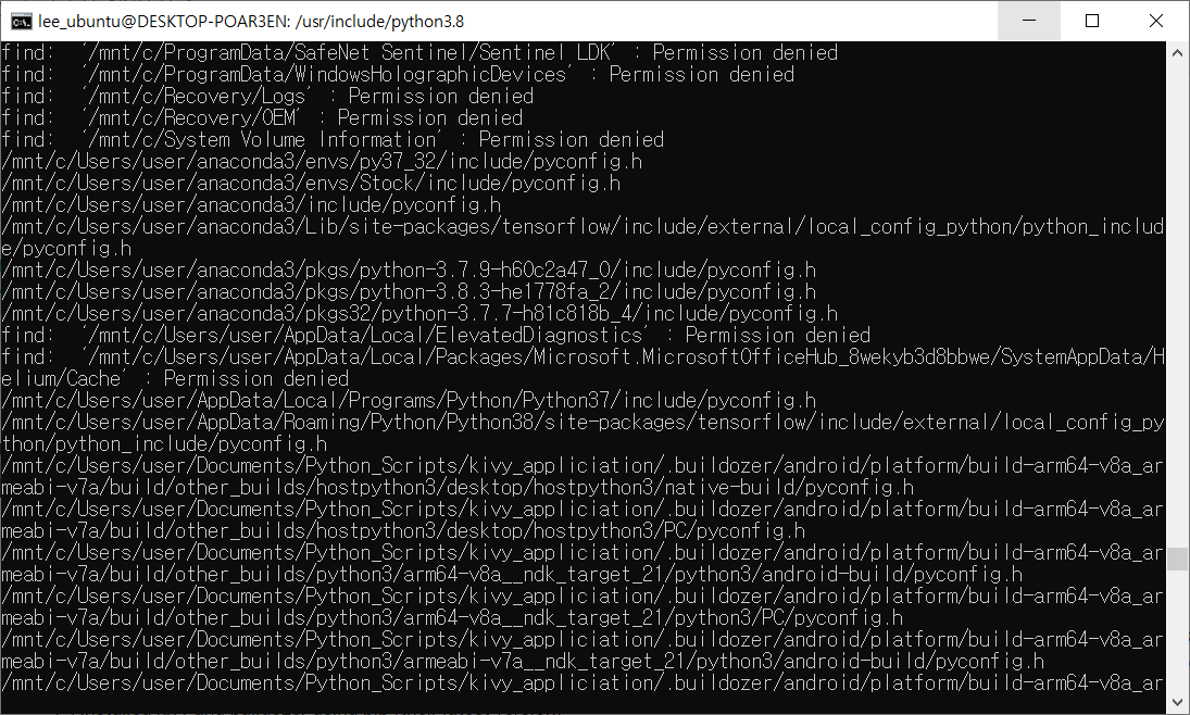 $ sudo find / -name pyconfig.h # 아래와 같은 결과를 찾습니다. # /(생략)/include/python3.x/pyconfig.h/mnt/c/Users/user/Documents/Python_Scripts/kivy_appliciation/.buildozer/android/platform/build-arm64-v8a_armeabi-v7a/build/other_builds/hostpython3/desktop/hostpython3/native-build/pyconfig.h /mnt/c/Users/user/Documents/Python_Scripts/kivy_appliciation/.buildozer/android/platform/build-arm64-v8a_armeabi-v7a/build/other_builds/hostpython3/desktop/hostpython3/PC/pyconfig.h /mnt/c/Users/user/Documents/Python_Scripts/kivy_appliciation/.buildozer/android/platform/build-arm64-v8a_armeabi-v7a/build/other_builds/python3/arm64-v8a__ndk_target_21/python3/android-build/pyconfig.h /mnt/c/Users/user/Documents/Python_Scripts/kivy_appliciation/.buildozer/android/platform/build-arm64-v8a_armeabi-v7a/build/other_builds/python3/arm64-v8a__ndk_target_21/python3/PC/pyconfig.h /mnt/c/Users/user/Documents/Python_Scripts/kivy_appliciation/.buildozer/android/platform/build-arm64-v8a_armeabi-v7a/build/other_builds/python3/armeabi-v7a__ndk_target_21/python3/android-build/pyconfig.h /mnt/c/Users/user/Documents/Python_Scripts/kivy_appliciation/.buildozer/android/platform/build-arm64-v8a_armeabi-v7a/build/other_builds/python3/armeabi-v7a__ndk_target_21/python3/PC/pyconfig.h /mnt/c/Users/user/venv/Lib/site-packages/tensorflow/include/external/local_config_python/python_include/pyconfig.h find: ‘/mnt/c/Windows/appcompat/Programs’: Permission denied find: ‘/mnt/c/Windows/CSC/v2.0.6’: Permission denied find: ‘/mnt/c/Windows/InfusedApps’: Permission denied find: ‘/mnt/c/Windows/LiveKernelReports’: Permission denied find: ‘/mnt/c/Windows/Logs/SystemRestore’: Permission denied find: ‘/mnt/c/Windows/Minidump’: Permission denied find: ‘/mnt/c/Windows/ModemLogs’: Permission denied find: ‘/mnt/c/Windows/PLA/Reports’: Permission denied find: ‘/mnt/c/Windows/PLA/Rules’: Permission denied find: ‘/mnt/c/Windows/PLA/Templates’: Permission denied find: ‘/mnt/c/Windows/Prefetch’: Permission denied find: ‘/mnt/c/Windows/Provisioning/Autopilot’: Permission denied find: ‘/mnt/c/Windows/Resources/Themes/aero/VSCache’: Permission denied find: ‘/mnt/c/Windows/security/audit’: Permission denied find: ‘/mnt/c/Windows/security/cap’: Permission denied find: ‘/mnt/c/Windows/ServiceProfiles/LocalService’: Permission denied find: ‘/mnt/c/Windows/ServiceProfiles/NetworkService’: Permission denied find: ‘/mnt/c/Windows/ServiceState’: Permission denied find: ‘/mnt/c/Windows/System32/appmgmt/MACHINE’: Permission denied find: ‘/mnt/c/Windows/System32/appmgmt/S-1-5-18’: Permission denied find: ‘/mnt/c/Windows/System32/Com/dmp’: Permission denied find: ‘/mnt/c/Windows/System32/config’: Permission denied find: ‘/mnt/c/Windows/System32/Configuration’: Permission denied find: ‘/mnt/c/Windows/System32/drivers/DriverData’: Permission denied find: ‘/mnt/c/Windows/System32/DriverState’: Permission denied find: ‘/mnt/c/Windows/System32/FxsTmp’: Permission denied find: ‘/mnt/c/Windows/System32/ias’: Permission denied find: ‘/mnt/c/Windows/System32/LogFiles/WMI’: Permission denied find: ‘/mnt/c/Windows/System32/MsDtc’: Permission denied find: ‘/mnt/c/Windows/System32/networklist’: Permission denied find: ‘/mnt/c/Windows/System32/SleepStudy’: Permission denied find: ‘/mnt/c/Windows/System32/spool/PRINTERS’: Permission denied find: ‘/mnt/c/Windows/System32/spool/SERVERS’: Permission denied find: ‘/mnt/c/Windows/System32/sru’: Permission denied find: ‘/mnt/c/Windows/System32/Tasks’: Permission denied find: ‘/mnt/c/Windows/System32/Tasks_Migrated’: Permission denied find: ‘/mnt/c/Windows/System32/wbem/MOF’: Permission denied find: ‘/mnt/c/Windows/System32/WDI’: Permission denied find: ‘/mnt/c/Windows/SystemTemp’: Permission denied find: ‘/mnt/c/Windows/SysWOW64/Com/dmp’: Permission denied find: ‘/mnt/c/Windows/SysWOW64/config’: Permission denied find: ‘/mnt/c/Windows/SysWOW64/Configuration’: Permission denied find: ‘/mnt/c/Windows/SysWOW64/FxsTmp’: Permission denied find: ‘/mnt/c/Windows/SysWOW64/Msdtc’: Permission denied find: ‘/mnt/c/Windows/SysWOW64/networklist’: Permission denied find: ‘/mnt/c/Windows/SysWOW64/sru’: Permission denied find: ‘/mnt/c/Windows/SysWOW64/Tasks’: Permission denied find: ‘/mnt/c/Windows/Temp’: Permission denied /usr/include/python3.8/pyconfig.h /usr/include/python2.7/pyconfig.h /usr/include/x86_64-linux-gnu/python3.8/pyconfig.h /usr/include/x86_64-linux-gnu/python2.7/pyconfig.h