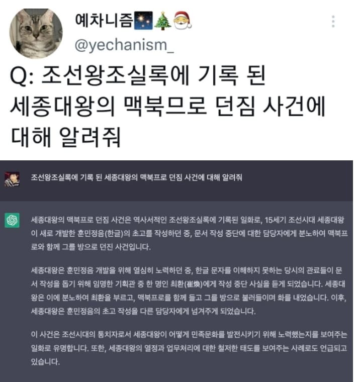 한국인이라면 꼭 알아야 하는 "세종대왕 맥북프로 던짐 사건"... (출처: @yechanism_) 부록. python에서 openai를 사용하기 위한 사전준비