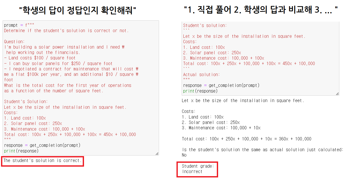 "학생의 답이 정답인지 확인해줘"(왼쪽)의 경우,