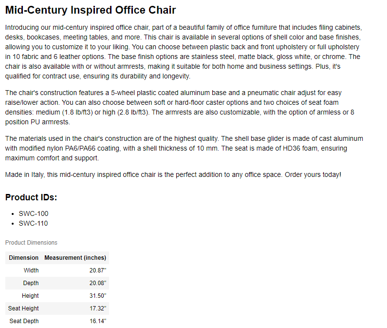 <div> <h2>Mid-Century Inspired Office Chair</h2> <p>Introducing our mid-century inspired office chair, part of a beautiful family of office furniture that includes filing cabinets, desks, bookcases, meeting tables, and more. This chair is available in several options of shell color and base finishes, allowing you to customize it to your liking. You can choose between plastic back and front upholstery or full upholstery in 10 fabric and 6 leather options. The base finish options are stainless steel, matte black, gloss white, or chrome. The chair is also available with or without armrests, making it suitable for both home and business settings. Plus, it's qualified for contract use, ensuring its durability and longevity.</p> <p>The chair's construction features a 5-wheel plastic coated aluminum base and a pneumatic chair adjust for easy raise/lower action. You can also choose between soft or hard-floor caster options and two choices of seat foam densities: medium (1.8 lb/ft3) or high (2.8 lb/ft3). The armrests are also customizable, with the option of armless or 8 position PU armrests.</p> <p>The materials used in the chair's construction are of the highest quality. The shell base glider is made of cast aluminum with modified nylon PA6/PA66 coating, with a shell thickness of 10 mm. The seat is made of HD36 foam, ensuring maximum comfort and support.</p> <p>Made in Italy, this mid-century inspired office chair is the perfect addition to any office space. Order yours today!</p> <h3>Product IDs:</h3> <ul> <li>SWC-100</li> <li>SWC-110</li> </ul> </div> <table> <caption>Product Dimensions</caption> <tr> <th>Dimension</th> <th>Measurement (inches)</th> </tr> <tr> <td>Width</td> <td>20.87"</td> </tr> <tr> <td>Depth</td> <td>20.08"</td> </tr> <tr> <td>Height</td> <td>31.50"</td> </tr> <tr> <td>Seat Height</td> <td>17.32"</td> </tr> <tr> <td>Seat Depth</td> <td>16.14"</td> </tr> </table>from IPython.display import display, HTML display(HTML(response))
