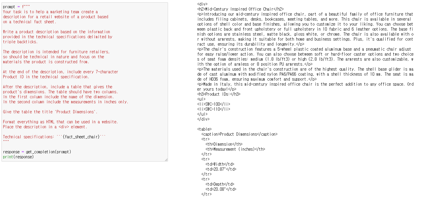 html형식의 response를 display한 결과 ChatGPT Prompt Engineering for Developers
