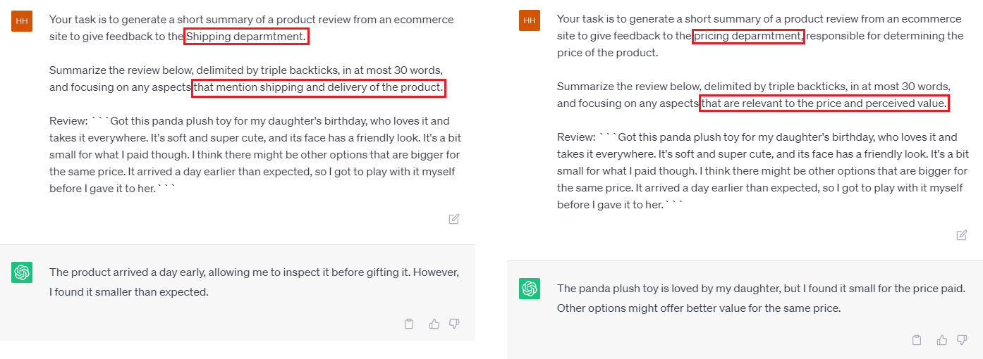 (좌) Shipping department를 위한 요약. (우) Pricing department를 위한 요약 똑같은 리뷰 글에 대해서